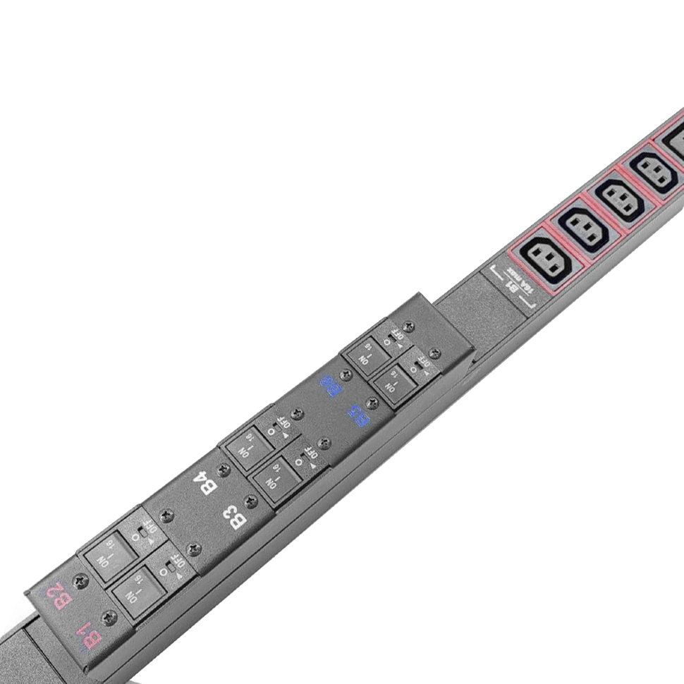 Блок розеток HIDEN трехфазный вертикальный, 36 розеток C13, 6 розеток C19, 32A, гидравлический электромагнитный выключатель 1P 16A на каждую группу розеток, кабель питания 3м с вилкой IEC 60309 32A (3P+N+E), возможность установки в лоток Zero-U, корпус ал